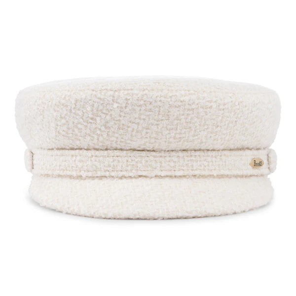 Die Shipper Cap ist ein kühner Cap-Style für Damen und kommt in einem gemütlichen Elfenbein-Bouclé-Stoff und erinnert an Winterlandschaften mit Schnee und blauem Himmel.