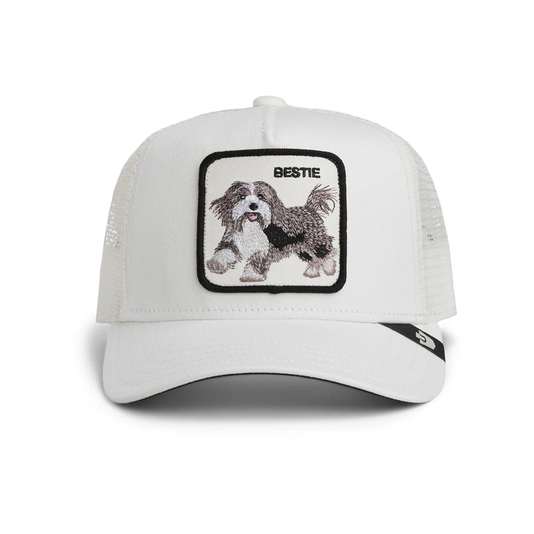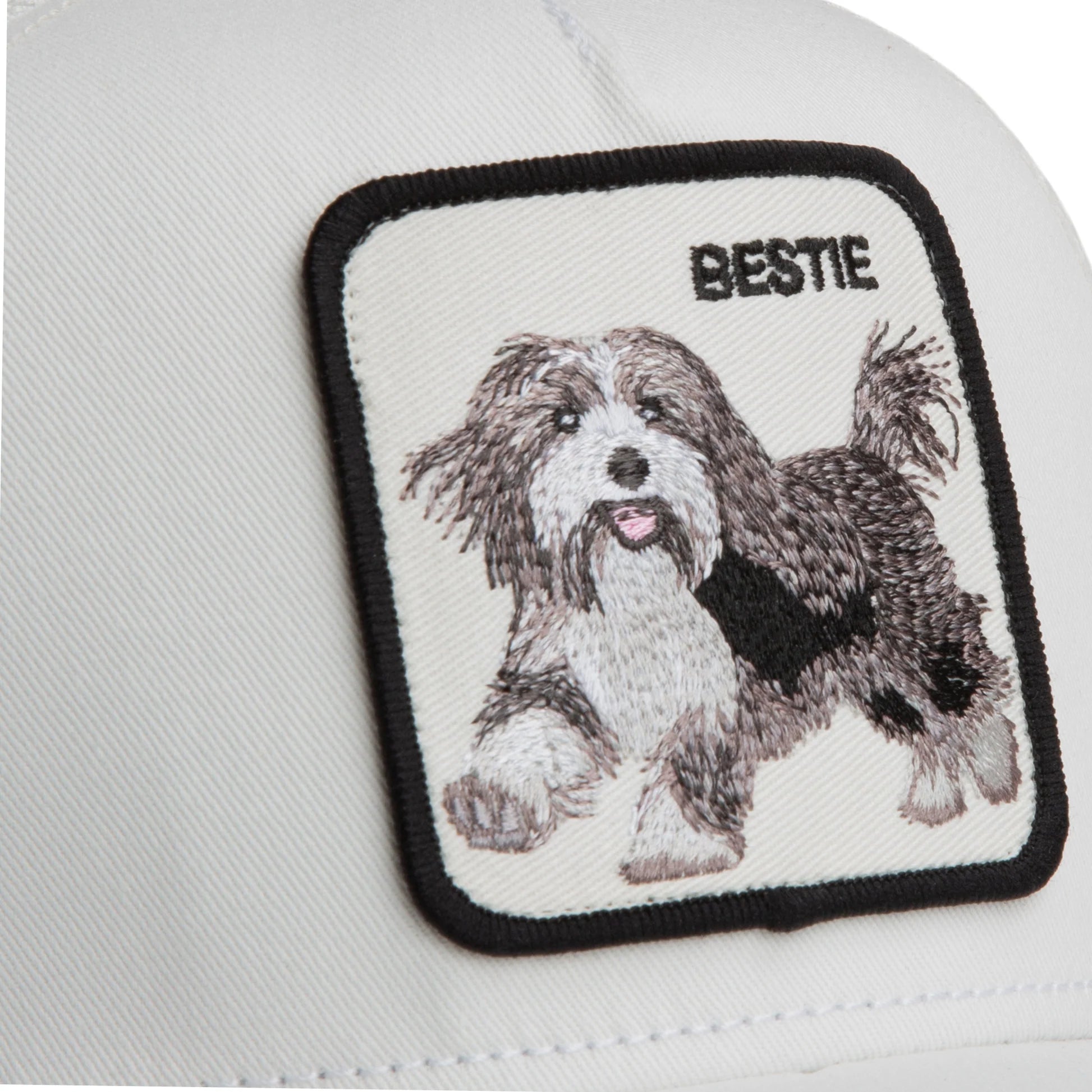 Die Goorin Bros Cap Bestie Mini kombiniert einen klassischen Trucker-Stil mit einer sorgfältig bestickten Front, die einen Hund und den Schriftzug "BESTIE" zeigt. Die Cap bietet dank ihres luftigen Mesh-Rückens eine hohe Atmungsaktivität und sorgt so auch an warmen Tagen für angenehmen Tragekomfort.